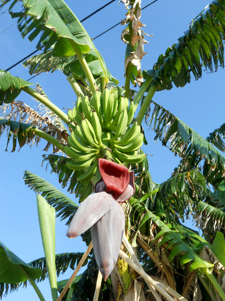 Among the palms along the fence across the street there are some banana trees, and this year we were surprised by some fruit. Odd looking “bloom,” this thing opened one or two of its leathery petals every day, and dropped them over night. Very strange! We left before the fruit turned yellow, so I don’t know if it’s any good for eating.