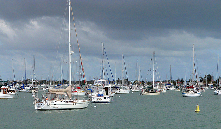 Some of the folks in there are living on little or nothing, some just like not to be attached to land. Some are there for a week or two, some have been there for years. Every morning there’s a “Cruisers’ Net” on VHF Channel 68. It’s an amazing community resource, with a different moderator every day. People are hailed hello as new arrivals or farewell on their departure; people list their buy/sell/giveaway items; people list their questions or problems about engines, electronics, health care or whatever; people talk about doings: yoga, pick-up softball, the cheese man from Pennsylvania is back, don’t miss the new show at the local theater. . . It’s wonderful stuff! When you’re “on a mooring ball” (much less expensive than being in a slip at the dock) you come into a dinghy dock somewhere to do the laundry, or do some shopping, or commute to your job.